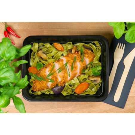 Składniki: Makaron zielony tagliatelle 51,9% (tagliatelle szpinakowe (mąka semolina z PSZENICY durum, szpinak suszony 2,5 %) 99,9%, sól 0,1%), Pierś z kurczaka 23,8% (pierś z kurczaka w płatkach kukurydzianych (pierś z kurczaka 75%, olej rzepakowy, płatki kukurydziane, bułka tarta /GLUTEN/, JAJA, mąka PSZENNA, sól, pieprz czarny) 100%), Warzywa 23,6% (marchew 28,7%, brokuł 26,9%, pieczarki 23,2%, cebula 19,1%, olej rzepakowy 2%), Szczypiorek 0,7%.