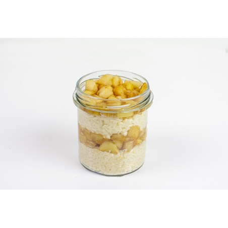 Składniki: ryż na mleku 77,1% (MLEKO, ryż arborio, cukier, cukier wanilinowy [cukier, wanilina]), jabłka 22,9% (jabłka prażone, cukier, kwas cytrynowy, cukier puder, cukier wanilinowy [cukier, wanilina], cynamon).