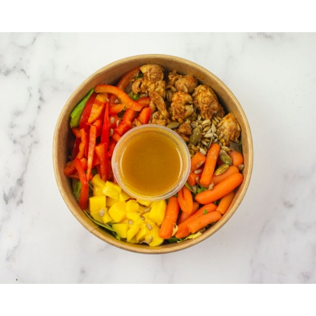 Składniki: Kurczak 21,4% (udka z kurczaka 97,2%, sos chili słodki (cukier, woda, chili 16 %, czosnek, sól, modyfikowana skrobia kukurydziana, regulator kwasowości: kwas octowy) 2%, olej rzepakowy 0,8%, papryka słodka 0%, pieprz czarny 0%, sól 0%), Sos fistaszkowy 19,1% (oliwa z oliwek 61,8%, masło ORZECHOWE /ORZESZKI ARACHIDOWE/ 33,3%, ocet ryżowy (woda, ryż) 4,8%, sól 0,1%), Mix sałat 18,2% (mix sałat (rukola, cykoria escarola, endywia frisee, radicchio) 100%), Papryka czerwona 16,7% (papryka czerwona 100%), Marchew 13,7% (marchew 100%), Mango 10,6% (mango 100%), Słonecznik prażony 0,3% (nasiona słonecznika 100%)