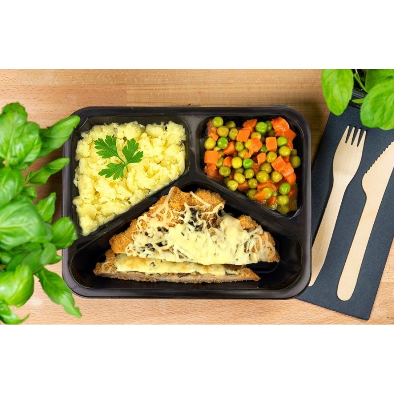 "Składniki: Puree ziemniaczane 39,4% (ziemniaki (95%), olej rzepakowy, tłuszcz roślinny, sól, biały pieprz), Kotlet schabowy 35,3% (schab wieprzowy 45%, JAJA 14,5%, pieczarki 11,3%, ser mozzarella (MLEKO, podpuszczka mikrobiologiczna, kultury bakterii, sól, skrobia ziemniaczana) 11,2%, bułka tarta (mąka PSZENNA, mąka ŻYTNIA, sól, drożdże) 10,3%, mąka PSZENNA 2,9%, smalec 2,3%, olej rzepakowy 1,6%, MLEKO 0,5%, cebula 0,2%, pieprz czarny 0%, sól 0%), Marchewka z groszkiem 23,7% (marchew 47,4%, groszek zielony 24,6%, woda 20,9%, masło /z MLEKA/4,3%, mąka PSZENNA 1,9%, cukier 0,5%, sól 0,5%), Koperek 1,6% (koper 100%)